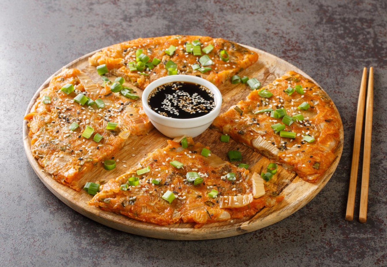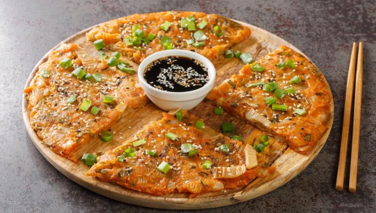 Kimčius pasmulkinkite iki kąsnio dydžio gabalėlių. Dubenyje sumaišykite vandenį su miltais, kad neliktų gumulėlių. Sudėkite kimčius, skystį nuo jų, smulkintus svogūnų laiškus, cukrų ir gerai išmaišykite. Galite įmaišyti ir kitų priedų, tokių kaip smulkinti grybai ar paprika. Įkaitinkite keptuvę ir dosniai įpilkite aliejaus. Kai jis įkais, supilkite blynų tešlą ir šaukštu paskleiskite po keptuvę. Kepkite apie 3–5 minutes, kol apačia bus aukso geltonumo ir traški. Apverskite, jeigu reikia – kraštuose įpilkite dar aliejaus, ir kepkite dar 3–5 minutes. Perkelkite lėkštę ir iškart mėgaukitės!